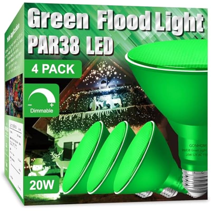 4 Pack PAR38 Green Flood Lights Outdoor,Dimmable LED Green Light Bulbs,20W(Equivalent to 200W),E26 Base,Outdoor Porch,Holiday Lighting,LED Flood Light Bulb for Halloween,Christmas