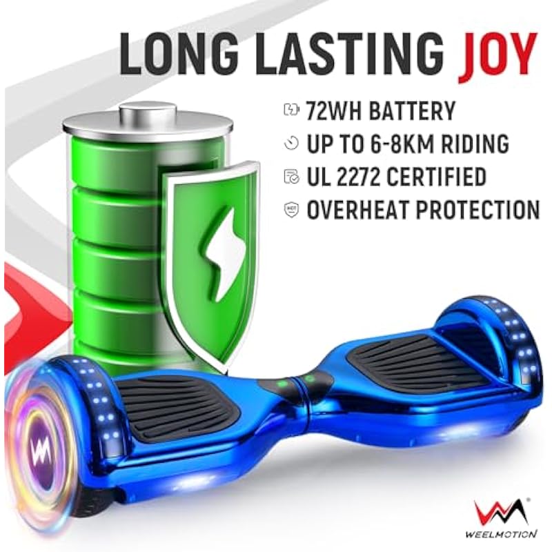 - ✔️ Certified Safe: All WEELMOTION hover boards have been UL 2272 certified and passed strict battery and charger tests to ensure rides’ ultimate safety. Build-in no fall technology ensure riders’ safety and make it easier for beginners. Multiple security measures have been incorporated such as Overheat Protection, Short Circuit Protection, Fire Protection Shell, and Over-speed alert