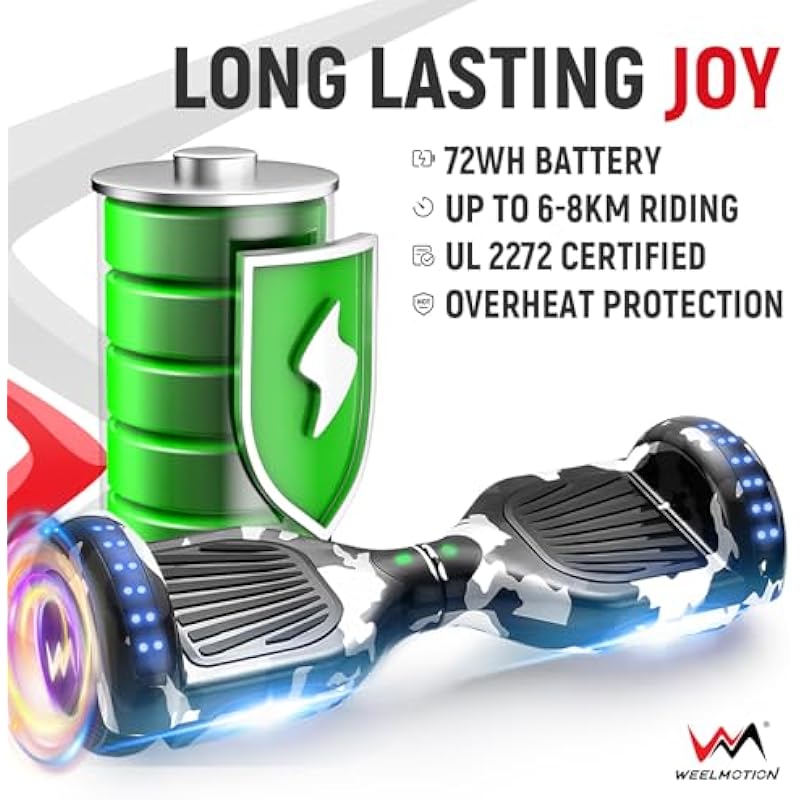 - ✔️ Safety: All WEELMOTION hoverboards have been UL 2272 certified and passed strict battery and charger tests to ensure rides’ ultimate safety. Build-in no fall technology ensure riders’ safety and make it easier for beginners. Multiple security measures have been incorporated such as Overheat Protection, Short Circuit Protection, Fire Protection Shell, and Over-speed alert