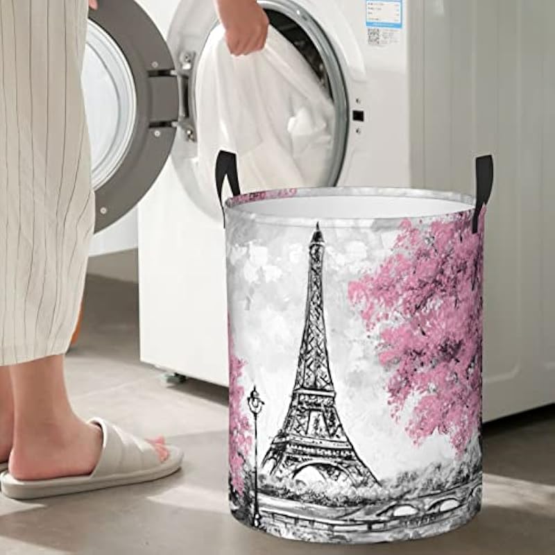 62l Round Laundry Hamper Retro Paris Eiffel Tower Storage Basket Waterproof Coating Organizer Bin For Nursery Clothes Toys