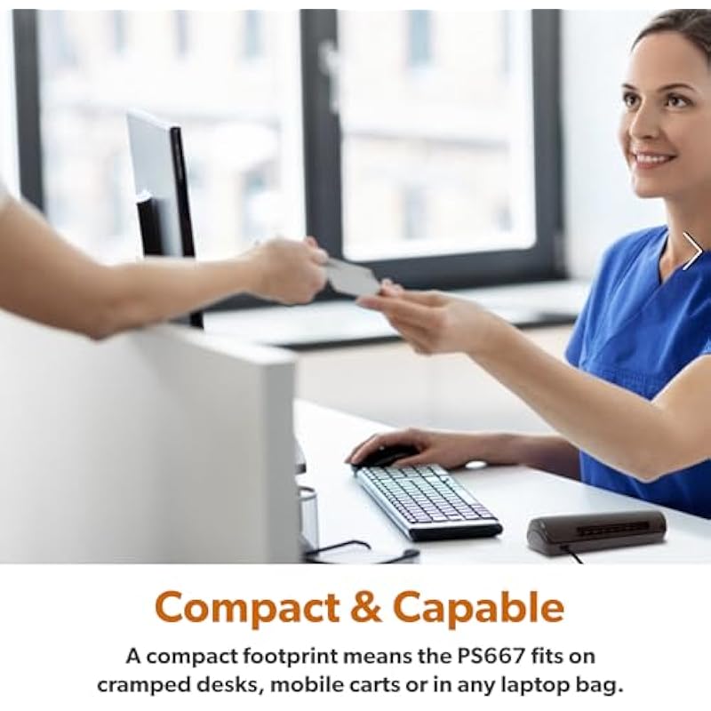 - EFFICIENT CARD AND ID SCANNING: The ImageScan Pro 667 is a rugged simplex card scanner. Because it’s USB-powered, you’ll never need to search for an outlet. Weighing just under one pound and about 8” long, it fits on any crowded desk, registration area or mobile cart.