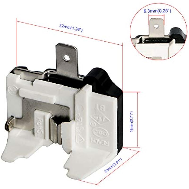 - 👌Refrigerator Overheat Protector Power: 1/4 HP (180W), Overall Size: 32mm X 23mm X 18mm (1.26″ X 0.91″ X 0.71″), Metal Sheet Width: 6.3mm / 0.25″.