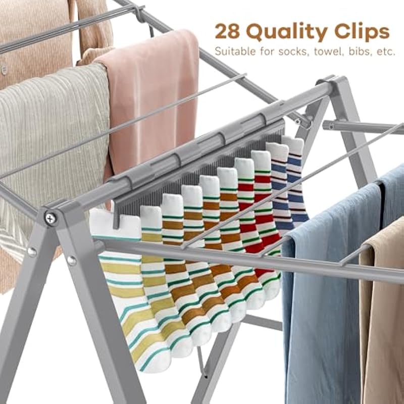 - Versatile: Designed to meet various clothing drying needs, this rack offers different wing angles to accommodate T-shirts, pants, dresses, while the sock clips can hold multiple pairs of socks. The middle mesh pocket provides ample space for drying sweaters and delicate garments.