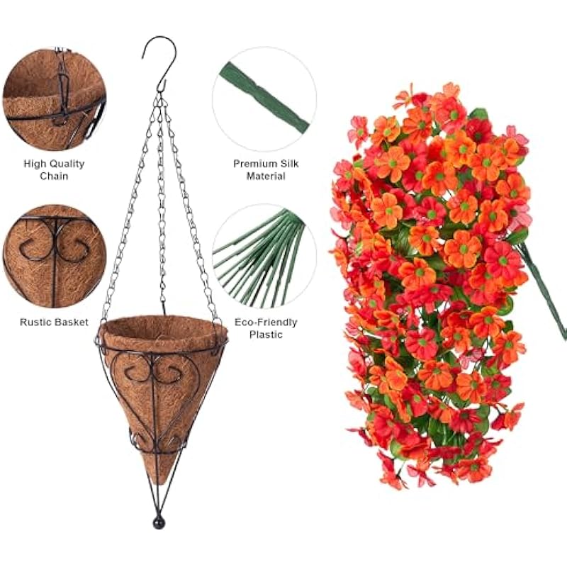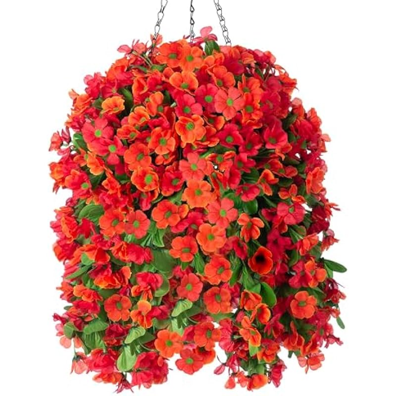 Artificial Hanging Flowers in 12 inch Basket, Fake Fall Plant Silk Orchid Flower Arrangement with Hanging Basket Daisy Planter for Patio Garden Porch Deck Summer Autumn Yard Decoration(Red Orange)