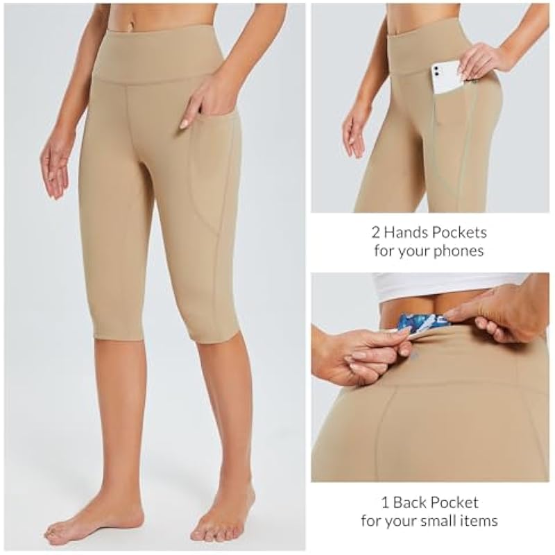baleaf Women’s Capri Leggings with Pockets High Waisted Knee Length Capris Stretch for Casual Yoga Pants Workout Exercise, Khaki, Medium