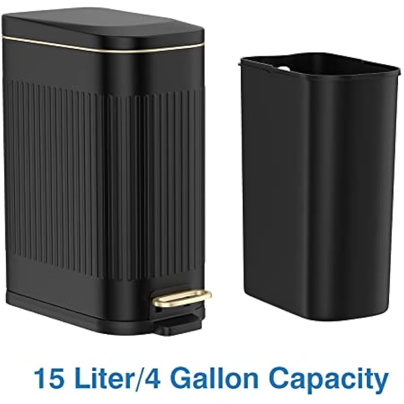 BETHEBEST 4 Gallon/15 Liter Trash Can with Soft Close Lid,Stainless Steel Trash Can with Removable Wastebasket, Rectangular Garbage Can for Bathroom,Kitchen,Office,Black