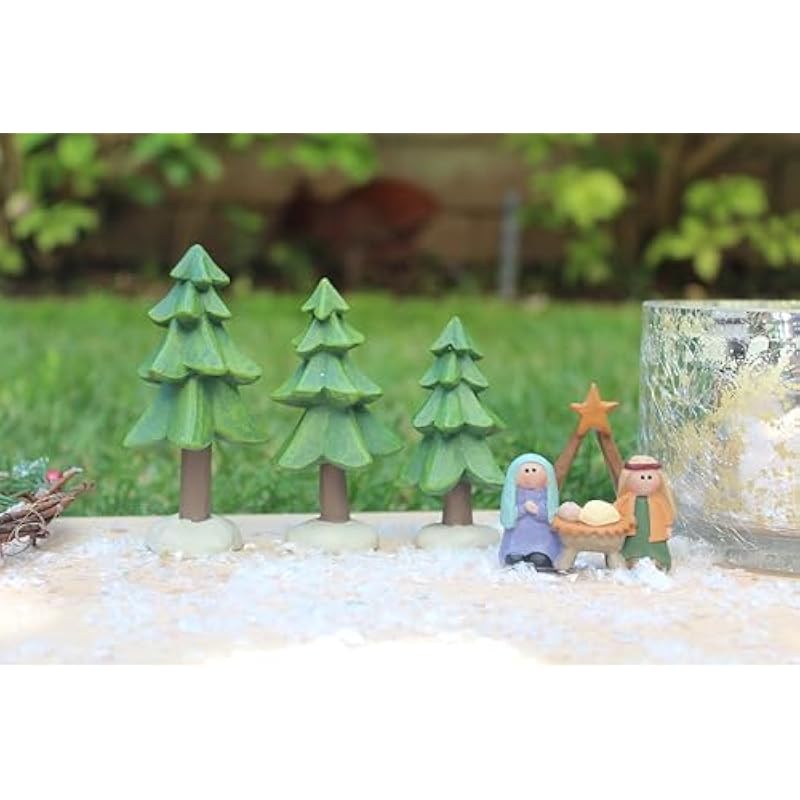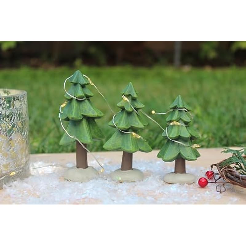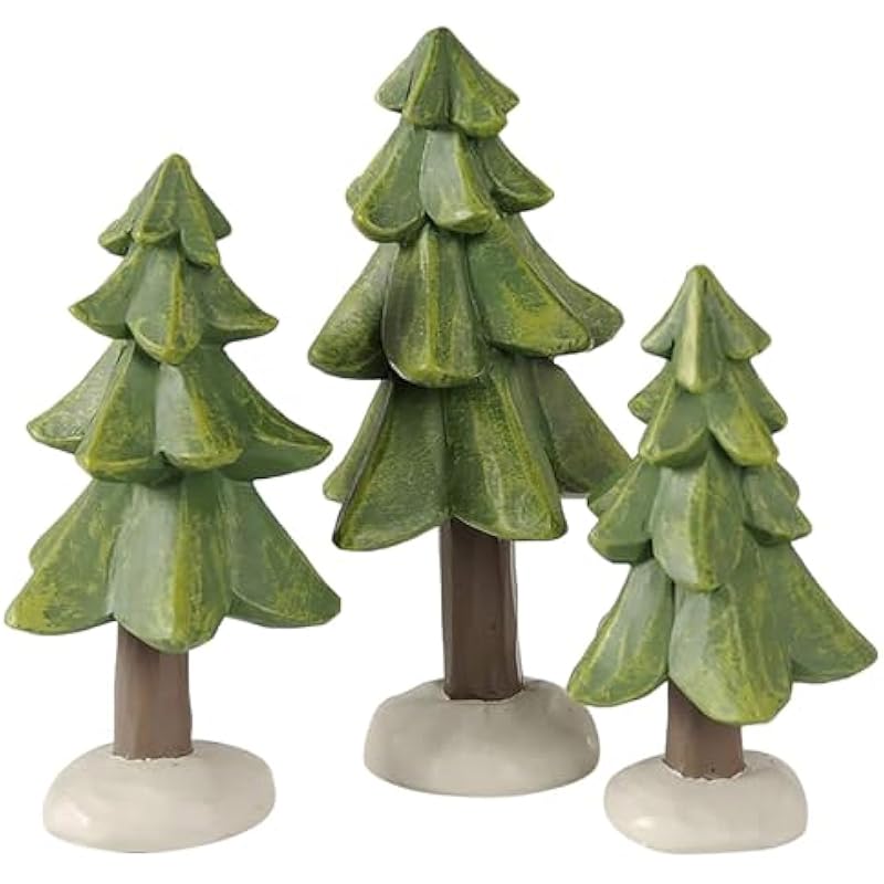 - Pine Trees Holiday Figurines come as a set of 3 assorted sizes; Each is a natural pine tree on snowy white base