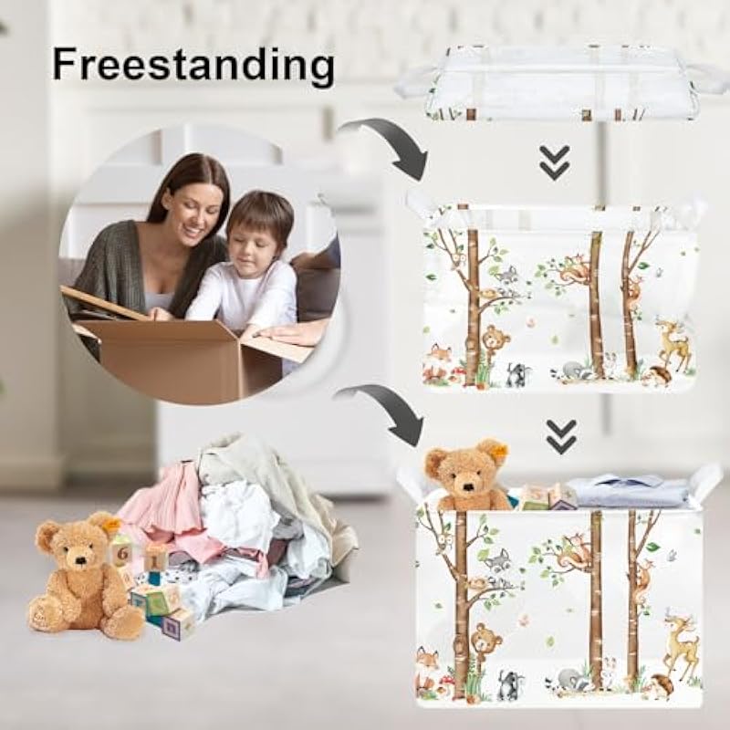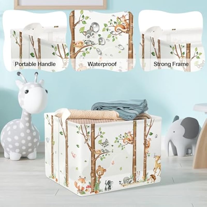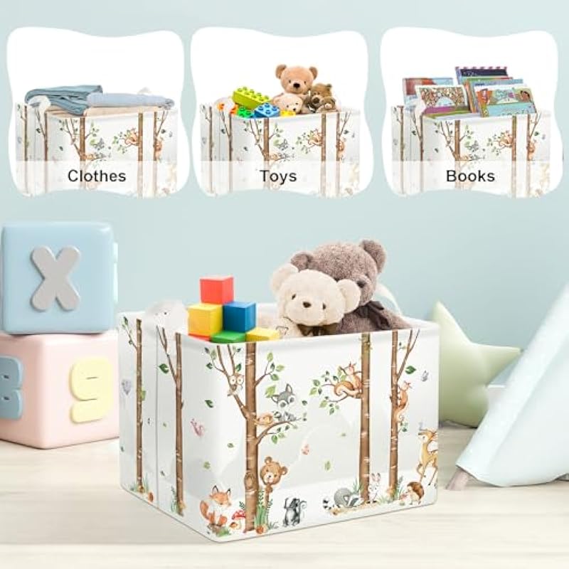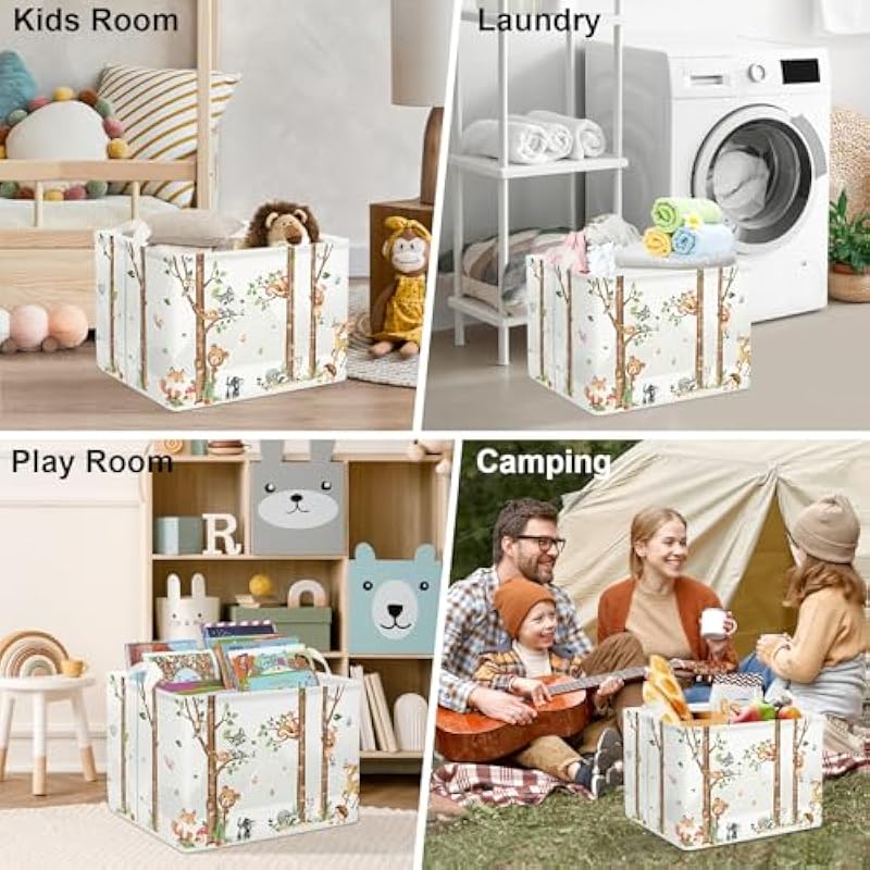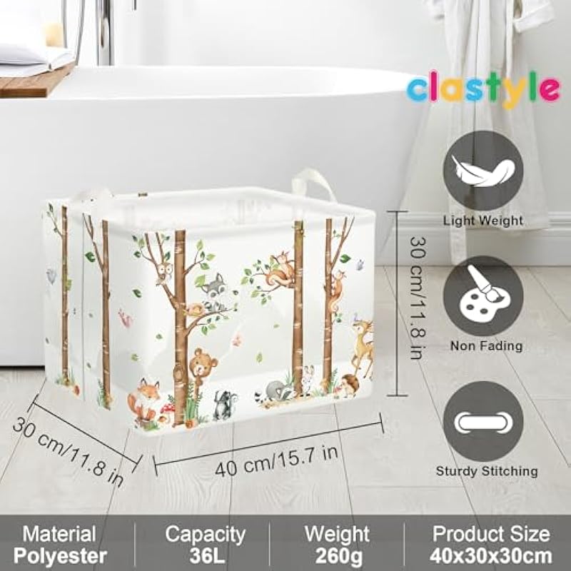 Clastyle 36L Large Birch Tree Animals Fox Bear Shelf Basket with Handle Collapsible Rectangle White Toy Clothes Cube Storage Basket for Kids Room
