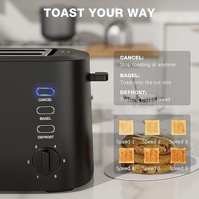 - CUSTOMIZABLE TOAST – Choose from 6 browning levels to get your ideal toast every time. Press CANCEL to stop the toasting process, BAGEL to toast just the cut side, and DEFROST to warm frozen slices.