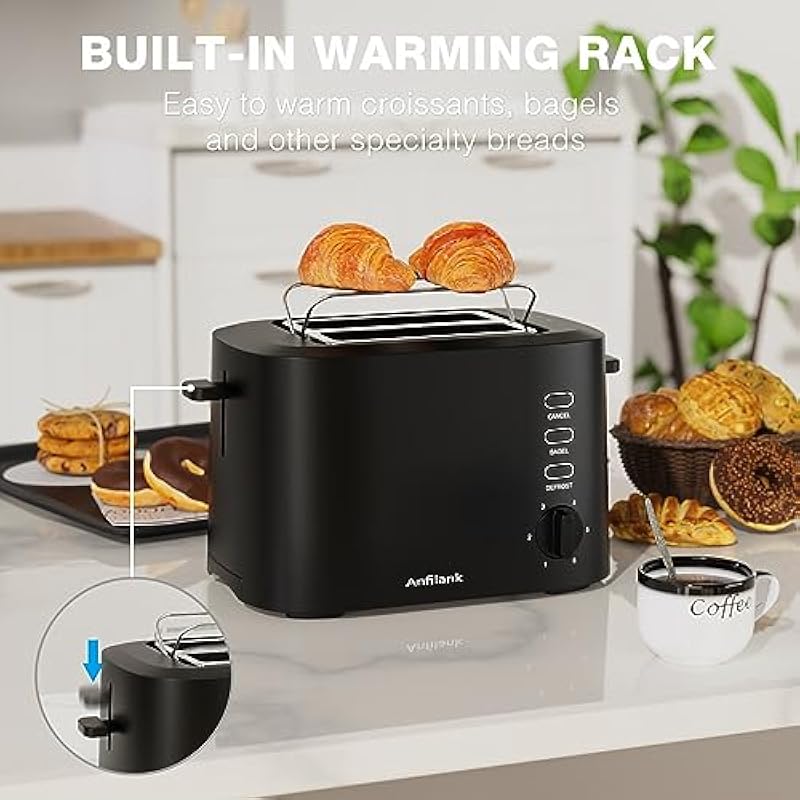 Compact 2 Slice Toaster with 1.5″ Extra Wide Slots, Built-in Warming Rack & Removable Crumb Tray – 6 Browning Options, with Defrost, Bagel, and Cancel Function – Matte Black