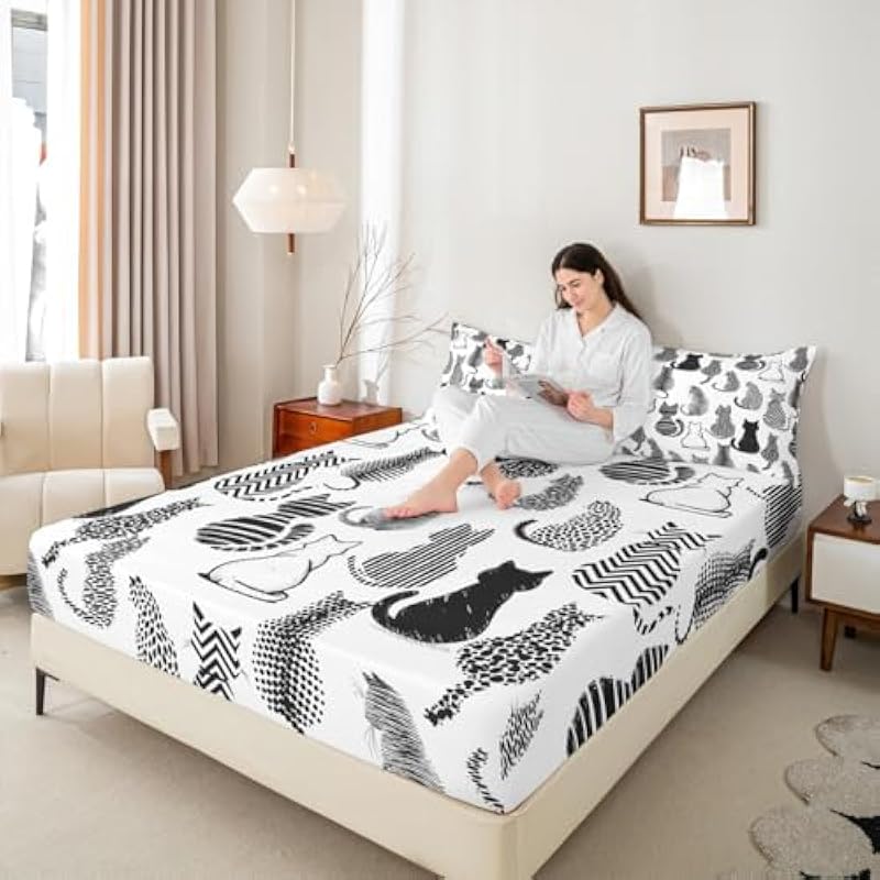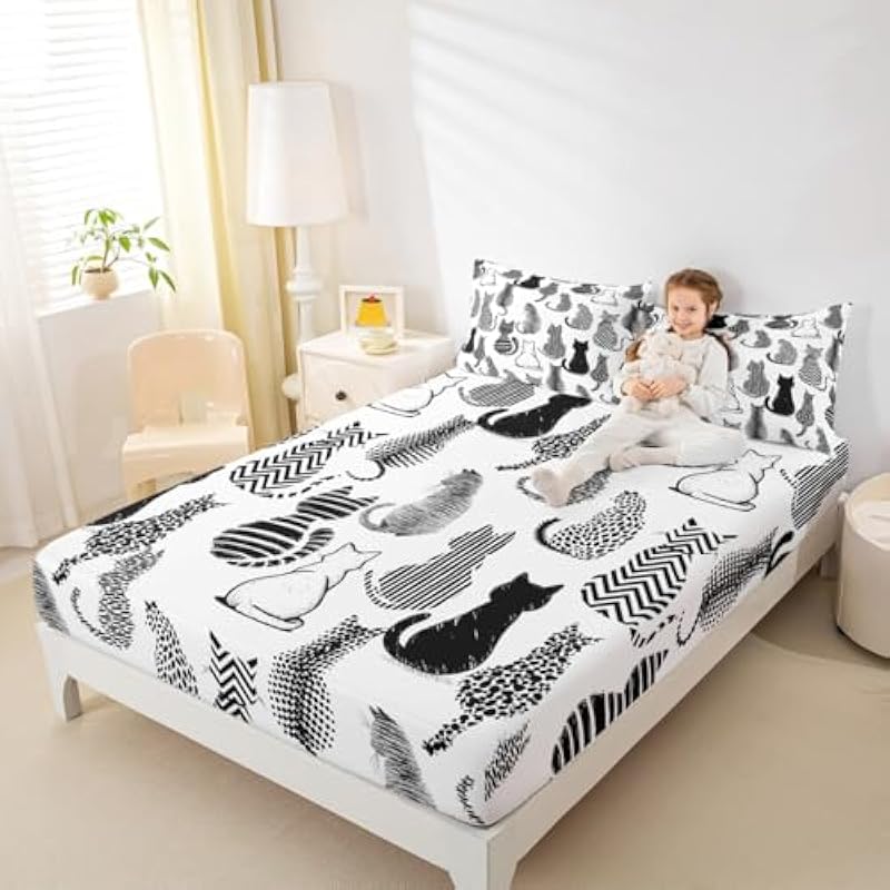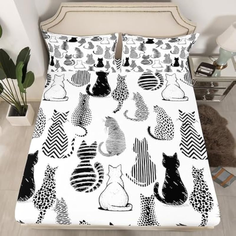 Cute Cat Pattern Fitted Sheet Queen Size Cat Silhouette Bedding Set Black and White Sheet Set,Striped Polka Dots Bed Cover Ultra Soft Breathable Bedspread 3 Pcs for Kids Teens Boys