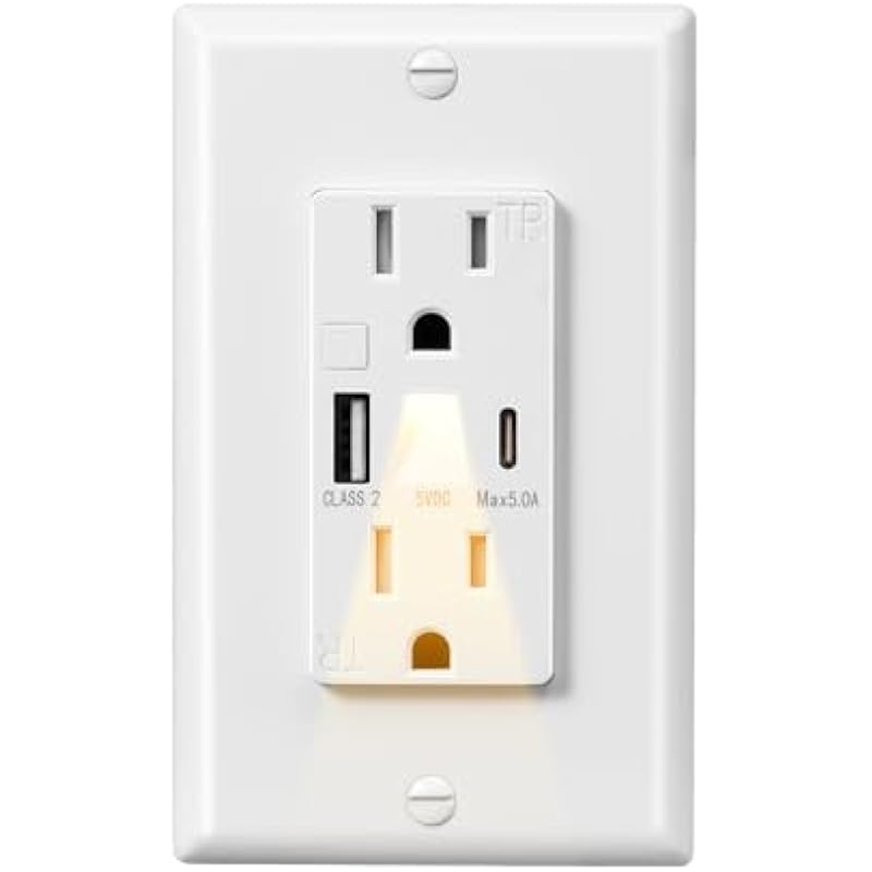 DEWENWILS USB Outlet with LED Night Light, 5V 4.8A Tamper-Resistant USB Wall Outlets with USB-A & USB-C Ports, Wall Plate for Kitchen, Bathroom, Office, White