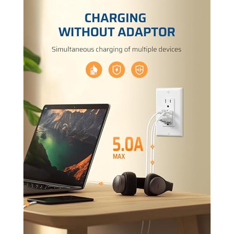 - [Fast Charging] No adapter needed for fast charging of phone, iPad, and other electronic devices; the USB wall outlet offers 5V 4.8A total output, with each port delivering up to 4.8A for rapid charging