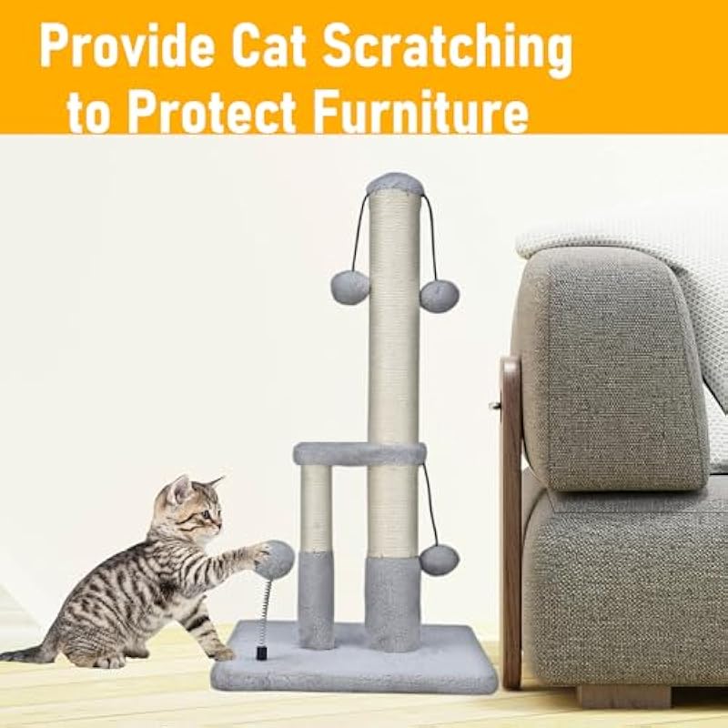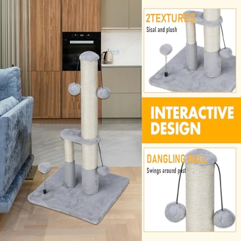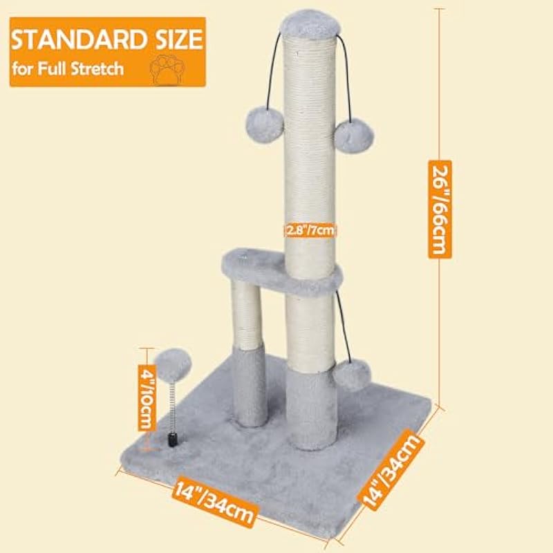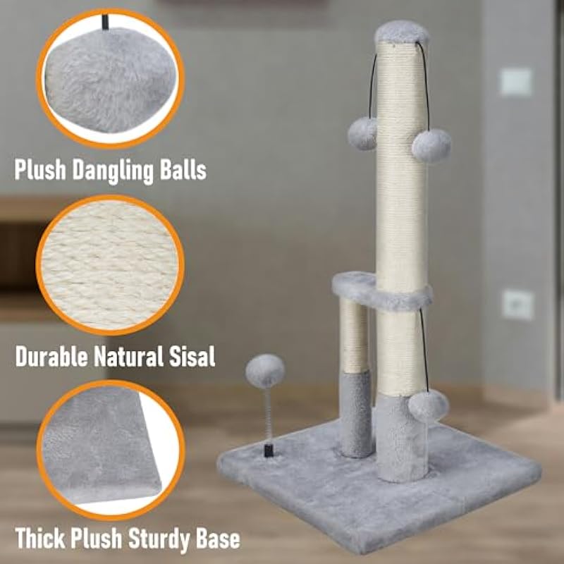 Dimaka Tall Cat Scratching Post, Double Lower Posts Extra Stable Cat Post Tree Scratcher with Sisal Rope and Teasing 4 Balls Total Large Base (Grey)