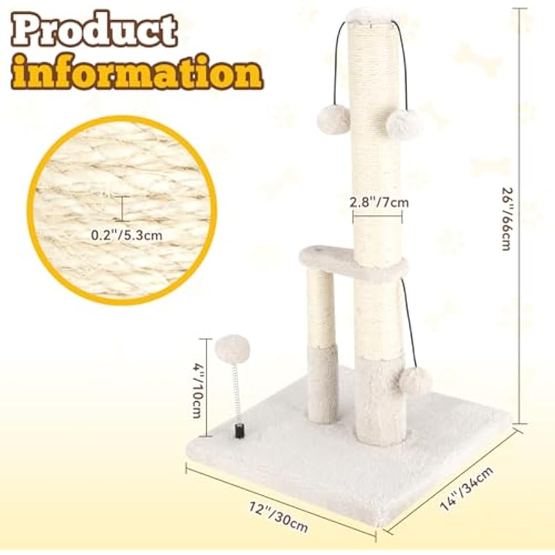 Dimaka Tall Cat Scratching Post, Double Lower Posts Extra Stable Cat Post Tree Scratcher with Sisal Rope and Teasing Balls, 4 Balls Total Large Base (Beige)