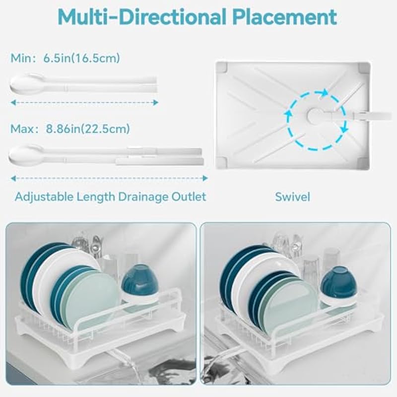 Dish Drying Rack Kitchen – Dish Racks for Kitchen Counter Space-Saving, Dish Drainer with Automatic Drain and Adjustable Spout, Dishwasher Rack with Cutlery Holder, Easy to Install, White