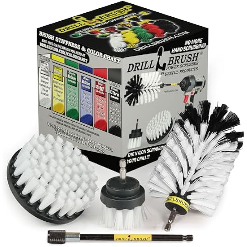 Drill Brush Power Scrubber by Useful Products – Drillbrush Soft White Automotive Cleaning kit with Extended Reach Attachment – Drill Bit Extension Carpet Cleaner Solution – Car Interior Brush Set