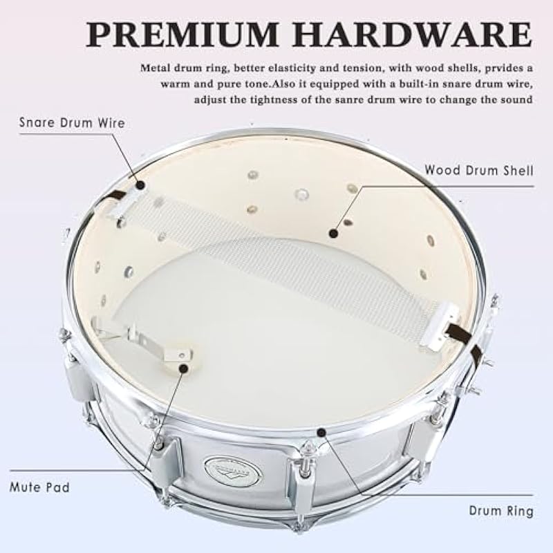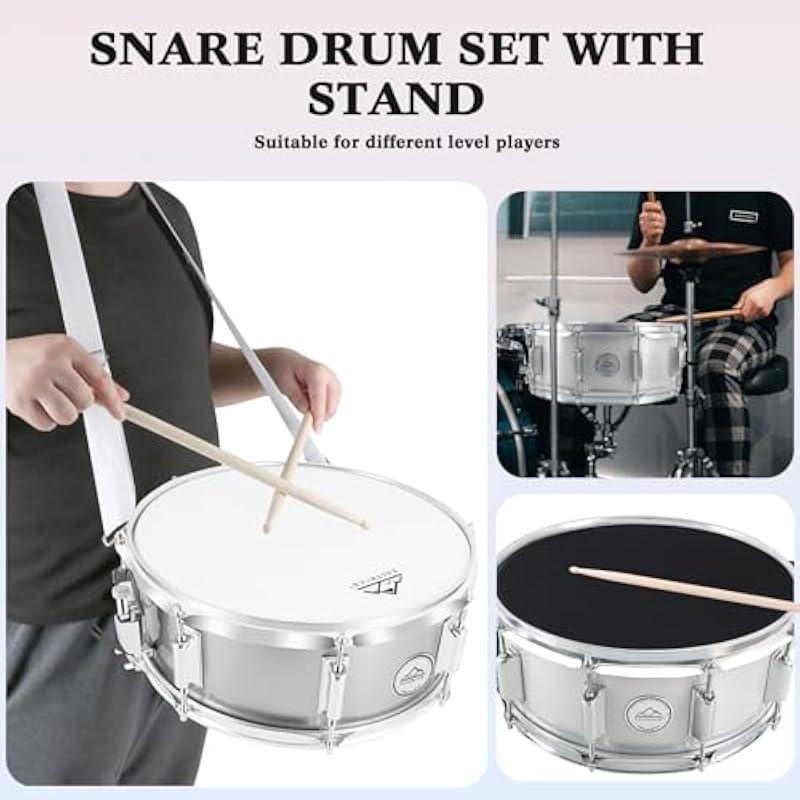 - Snare Drum Set: Ideal for any drummer’s collection or setup, like beginner, student, professionals, or any level drummers, and this 14×5.5” snare drum is suitable for any drum kit practice and performance, especially Pop music. Its sharp and powerful sound serves as a fantastic snare drum