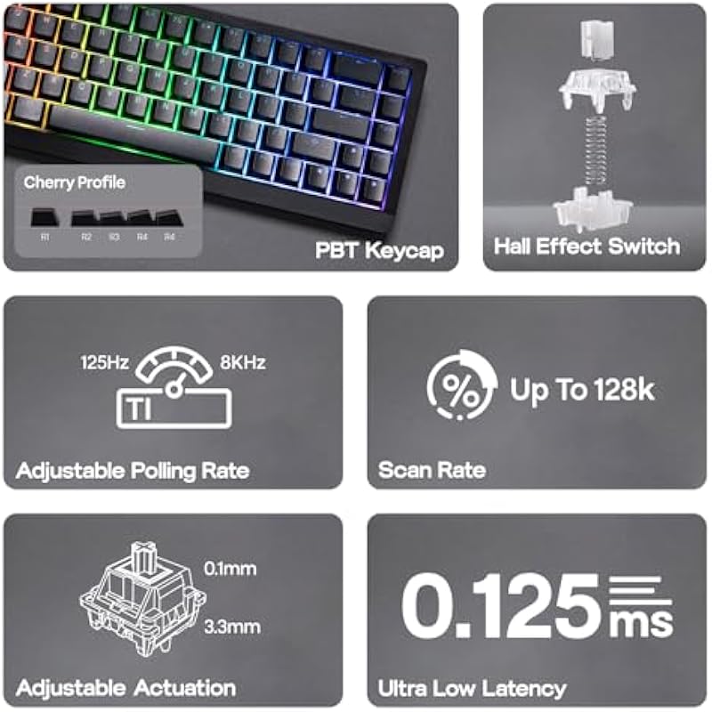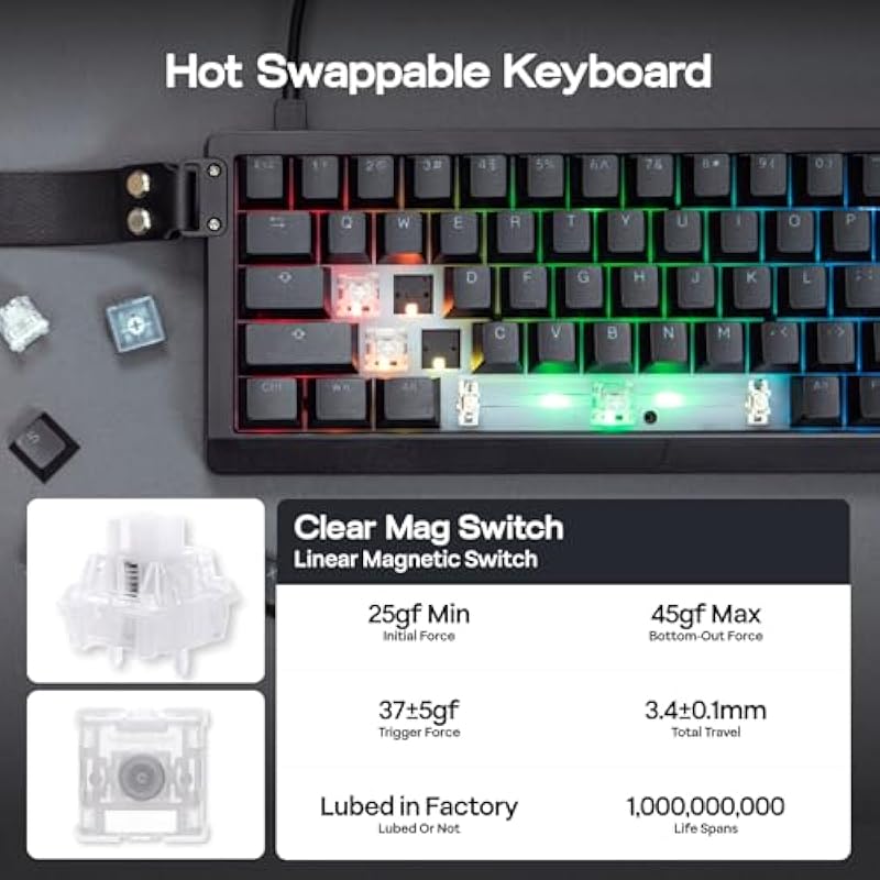 - 8,000 Hz Polling and 128,000 Scan Rate: Level up your gaming performance with smoother, more precise control, with the HE68 Lite magnetic gaming keyboard. Experience near-instantaneous key registration of 8khz polling rate, translating your commands into on-screen actions with unparalleled speed in 0.125 millisecond. Outmaneuver opponents and execute complex strategies flawlessly, with the super high 128khz per-key scan rate where even rapid-fire sequences are accurately captured.