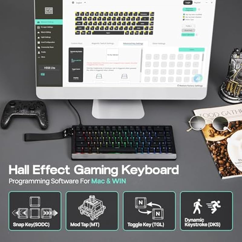- Dynamic Keystroke (DKS) & MT (Mod Tap): Rejoice in the astonishing accuracy and speed of HE68 Lite, for formidable actions in FPS, MOBA, Rhythm, and leisure games. Each keystroke is buttery smooth and consistent, with factory-lubed magnetic linear switch, with swift delivery of action from fingertip to screen; while DKS and MT function enables true analog input, as one stroke delivers up to 4 actions for common actions and key combos.