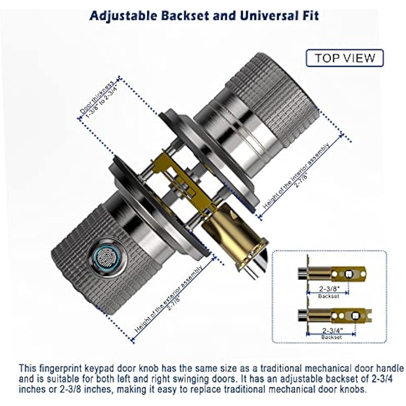 - Voice Navigation Programming and Easy Installation👈The keypad door knob features 📢 voice-guided programming for fingerprint and code registration,as well as other settings.The keypad is backlit for easy operation day or night.It’s easy to install with just a screwdrive.Come with a 2-3/8″ or 2-3/4″ adjustable latch,suitable for entrance and interior doors,wooden and metal doors,etc.