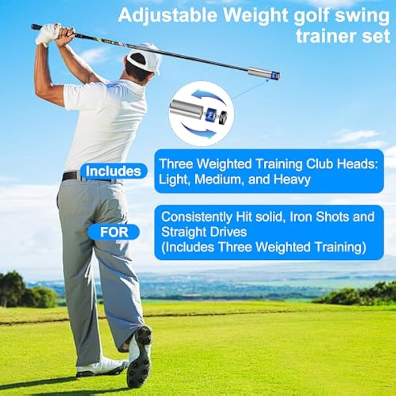 - Adjustable Weight golf swing trainer set includes Three Weighted Training Club Heads: Light, Medium, and Heavy FOR Consistently Hit solid, Iron Shots and Straight Drives (Includes Three Weighted Training)