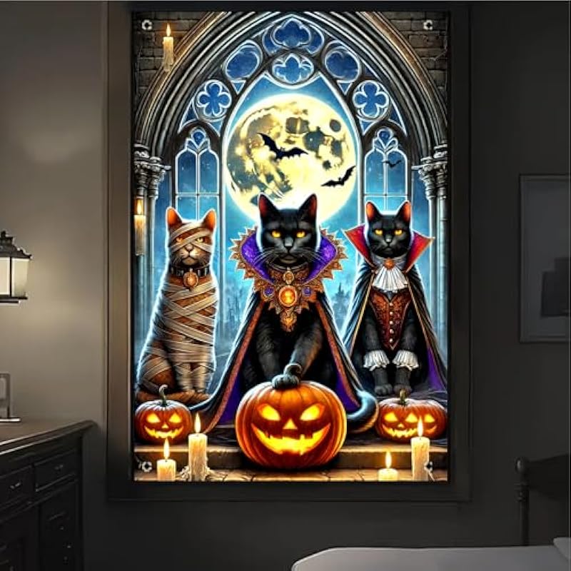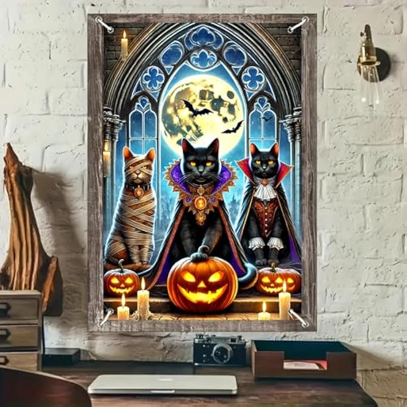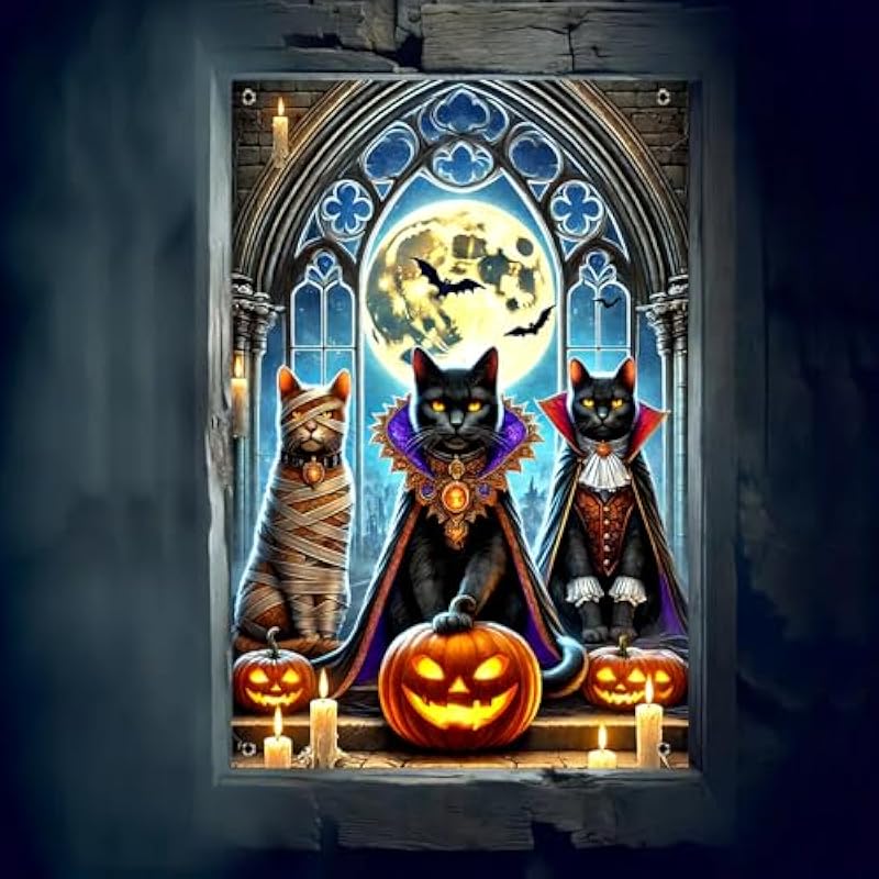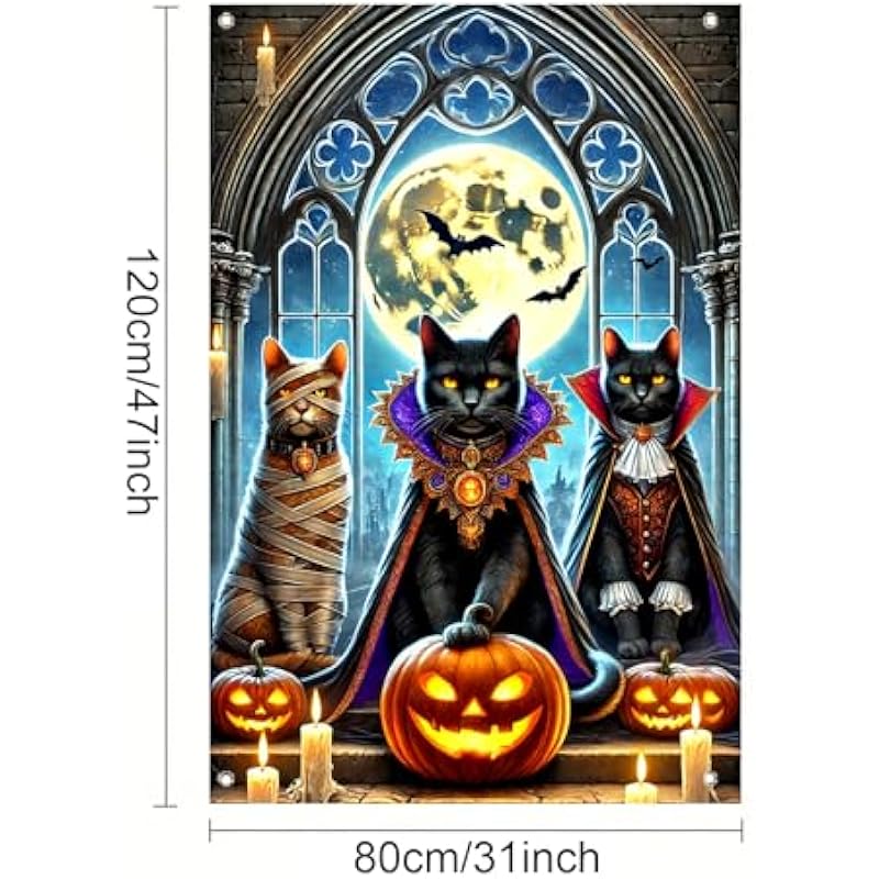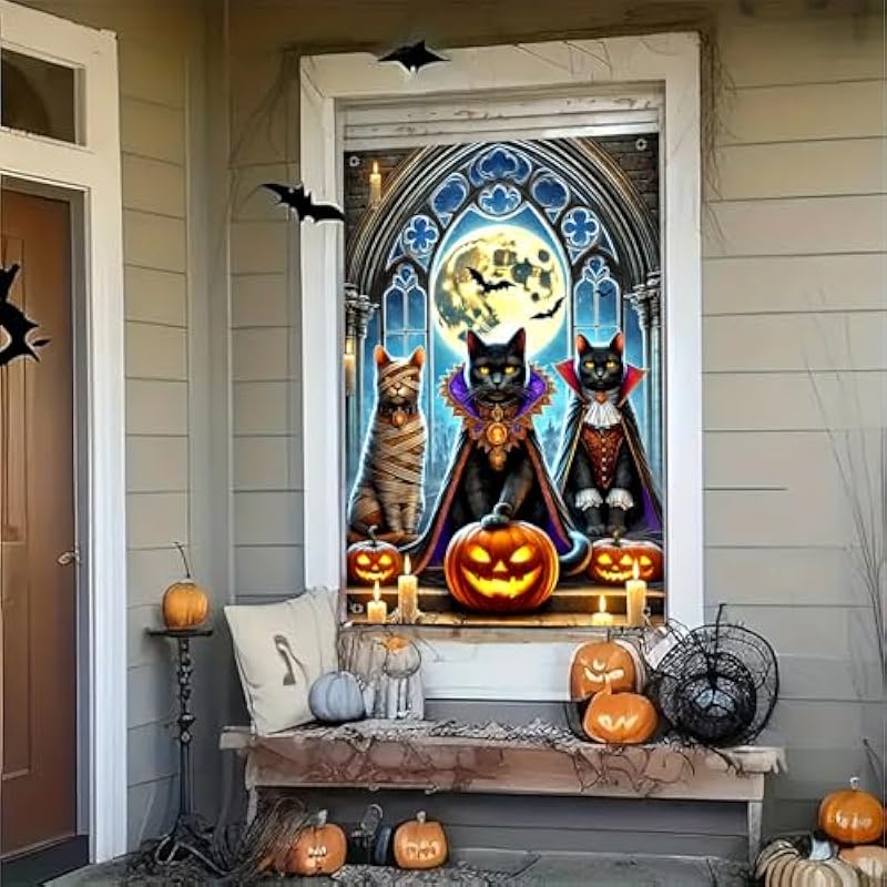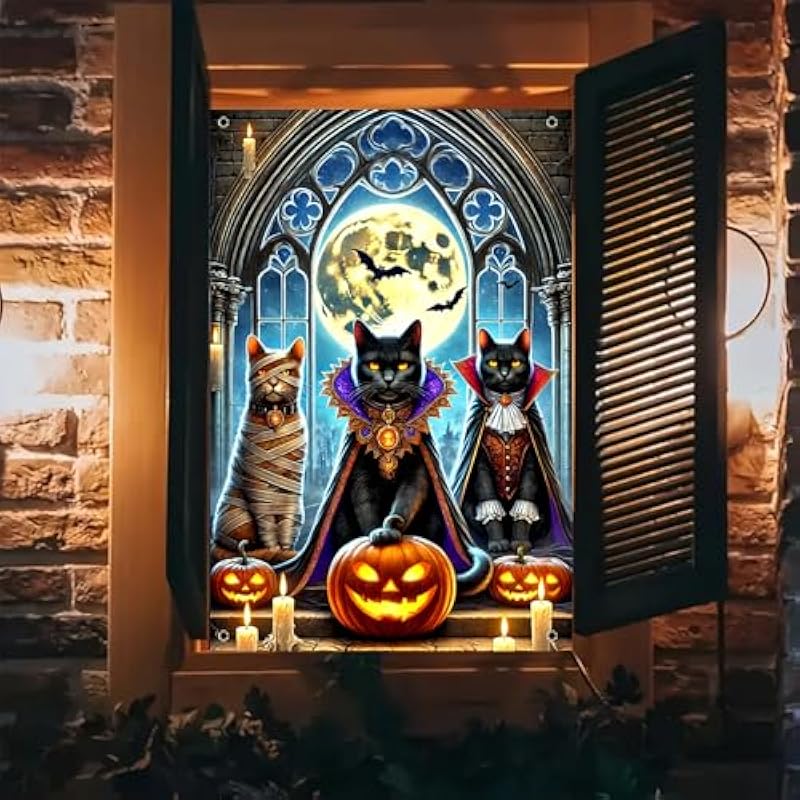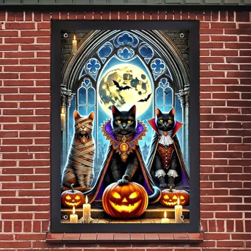 - Gothic Black Cat Trio: This halloween window banner features three black cats in spooky costumes including mummy and vampire capes creating gothic halloween window cover decor for spooky indoor outdoor halloween decorations and party backgrounds