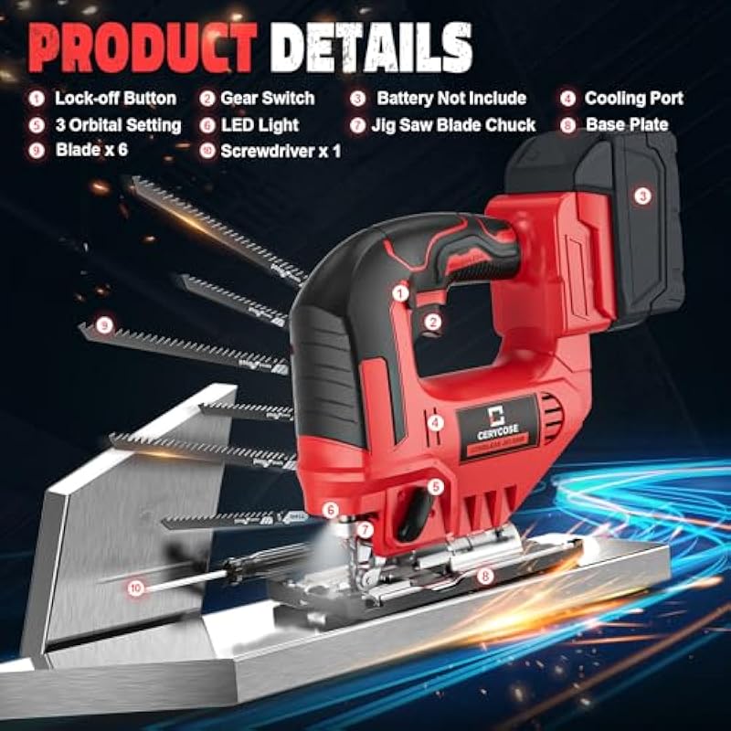 - Tool-free Blade Change & Safety Lock on button: Saw blades can be changed easily and quickly in seconds without requiring any additional tools; The jig saw use a safety lock off button to protect from in risk of careless injury without operation .