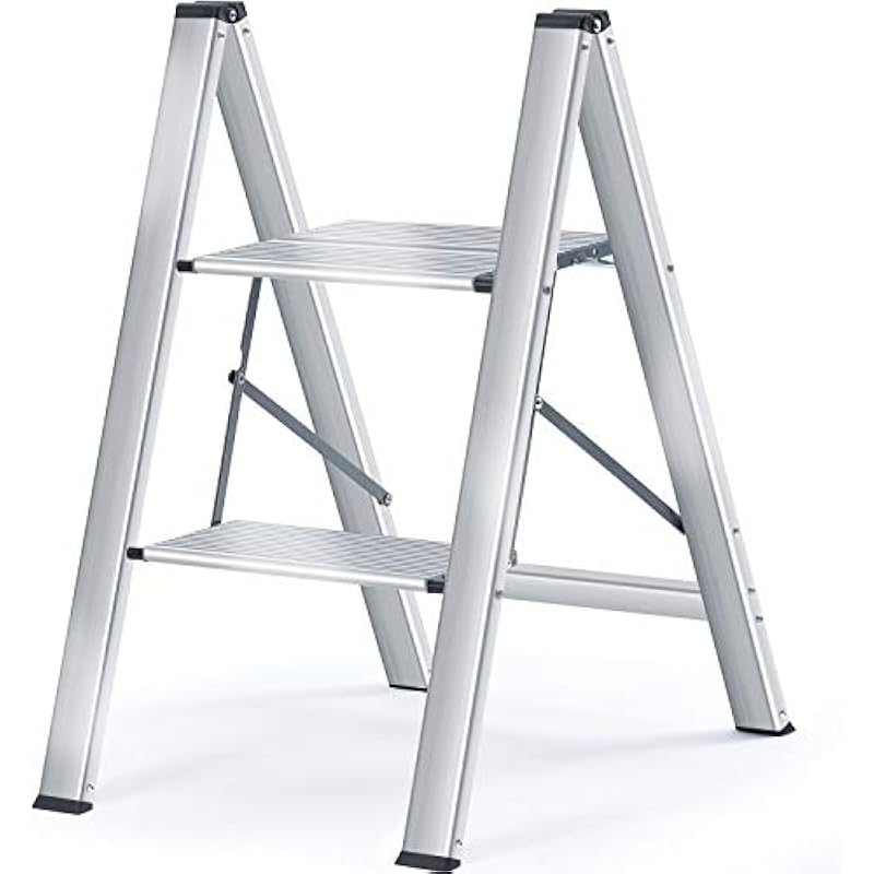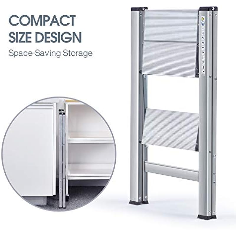 - 【1.57″ Slim Folding Design】The compact step ladder folds down very flat-only 1.57″ thickness,optimal for storage and transportation.The slim size greatly helps you save room space.