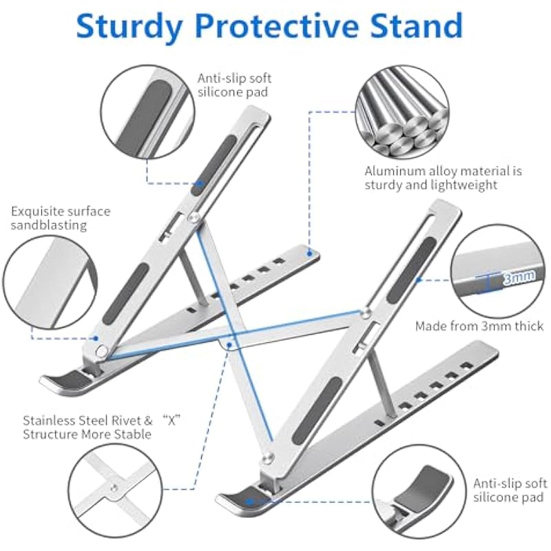 - Durable and Protective: Crafted from 3mm aluminum alloy, this laptop stand features extraordinary strength, supporting up to 40 pounds. The 12 carefully – designed silicone pads, which can protect your laptop from scratches and wear, prevent it from sliding when you are typing. Meanwhile, they firmly secure the stand to the desktop, ensuring a great user experience.