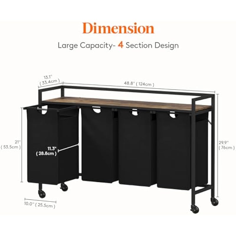 - Ample Storage Capacity: This laundry basket with wheels measures 48.8″(124cm)*13.1″(33.4cm) × 32.1″ (81.4cm) and comes with 4 laundry bags. Each bag is 10.0″(25.5cm)*11.3″(28.8cm)*21″(53.5cm). Single basket has a capacity of 42L and can hold up to 168L with 4 bags. The laundry hamper is great for sorting clothes by color and material, keeping your clothes organized, and saving you time.