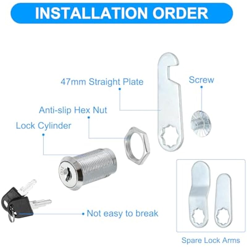 - Application: The keyed cam lock better protects your privacy and ensures the security of your belongings. The cam locks are widely used in drawer dressers, cabinets, file cabinets, mailboxes, storage cabinets, RV storage, and toolboxes.