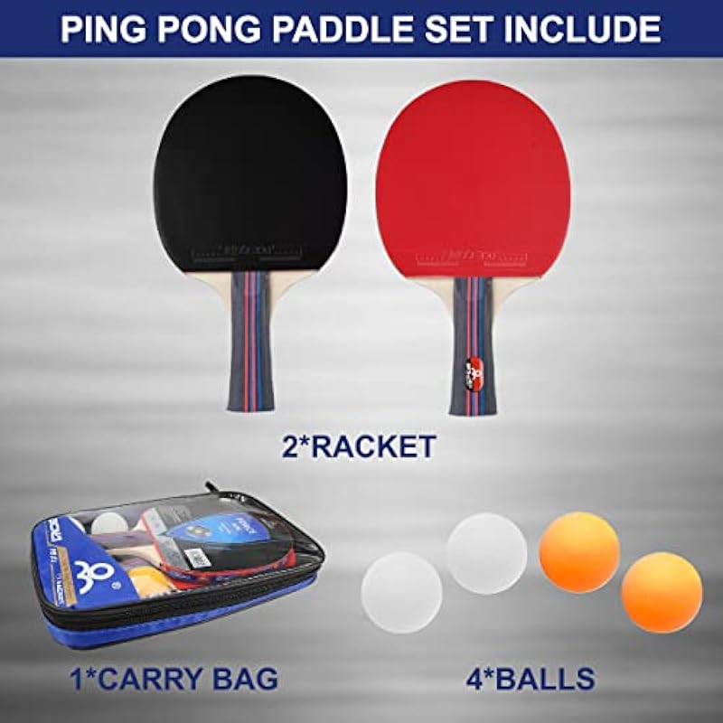- 【Complete Ping Pong Set】This premium indoor and outdoor ping pong racket set of table tennis paddles bundle comes with everything you need to enjoy solo or team play, with two ping-pong paddles and four durable ping pong balls.