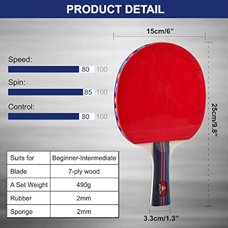 - 【Professional Quality】The rackets are made up of 7-ply blades with 7 mm thickness,crafted with durable rubber with premier thickness and balance for improved ball speed, control, spin. The ping pong balls have appropriate weight for a truly pro experience, ideal for any all-rounder and offer you the edge when playing loop strokes.