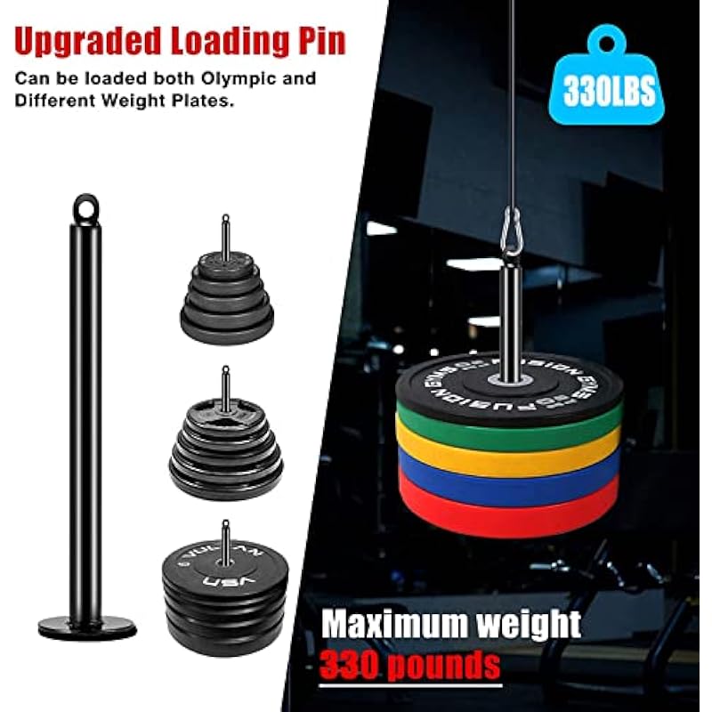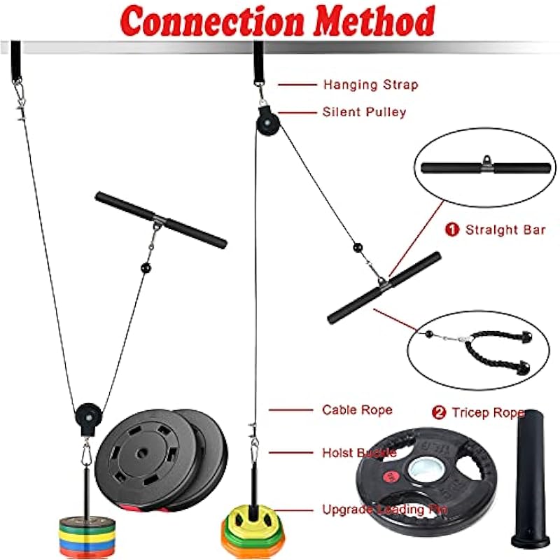 - 😋 EASY TO ASSEMBLE – The ends of the wire rope are connected to the loading pins and the center hole of the pull-down bar, and the pulley system is connected to the drive frame, the pull-up bar, the crossbar and anywhere the belt can be installed. Two functional training modes: pull down and lift, can be used to train biceps, triceps, shoulder muscles, etc. LAT pull down does not take up much space, so you can exercise at home.
