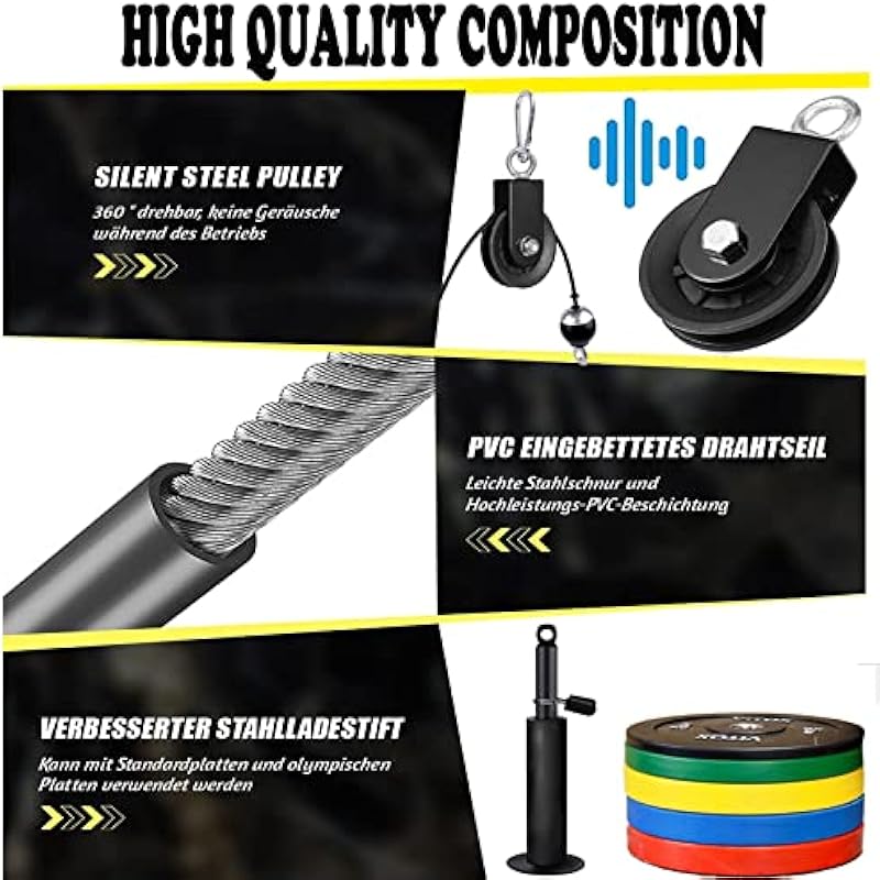- 😉 LAT PULLEY SYSTEM – Made of 100” high strength cable material, the rope’s anti-breakage ball design and heavy duty alloy buckle can prevent the rope from breaking, providing sufficient protection and durability. 360° rotatable silent pulley ensures quiet and stable operation of the pulley system. It is one of the ideal accessories for the pulley cable system.