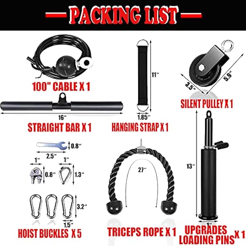 | Included Components | 1* Loading Pin 1* 100” Cable 1* Wear-resistant Strap 1* Silent Pulley 4* Hoist Buckles 1* Wrench 1* Straight Bar 1* Tricep Heavy Rope |