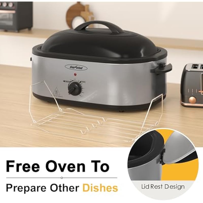 - 【Made for Delicious Roast Turkey】- If you want to make a BROWN, JUICY,CRISPY roasted turkey, please choose Sunvivi. 18qt roaster oven fits a turkey up to 22 pounds. 1450W-120V high energy circulating water, places the sauce inside the turkey. Allow the surface to be fully baked. Even a novice in the kitchen can make the perfect turkey!