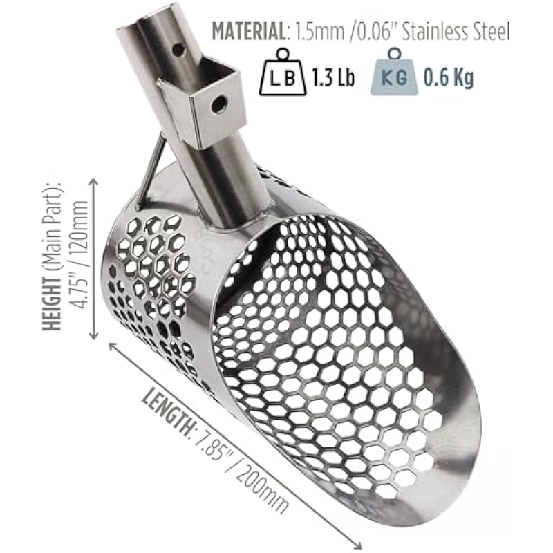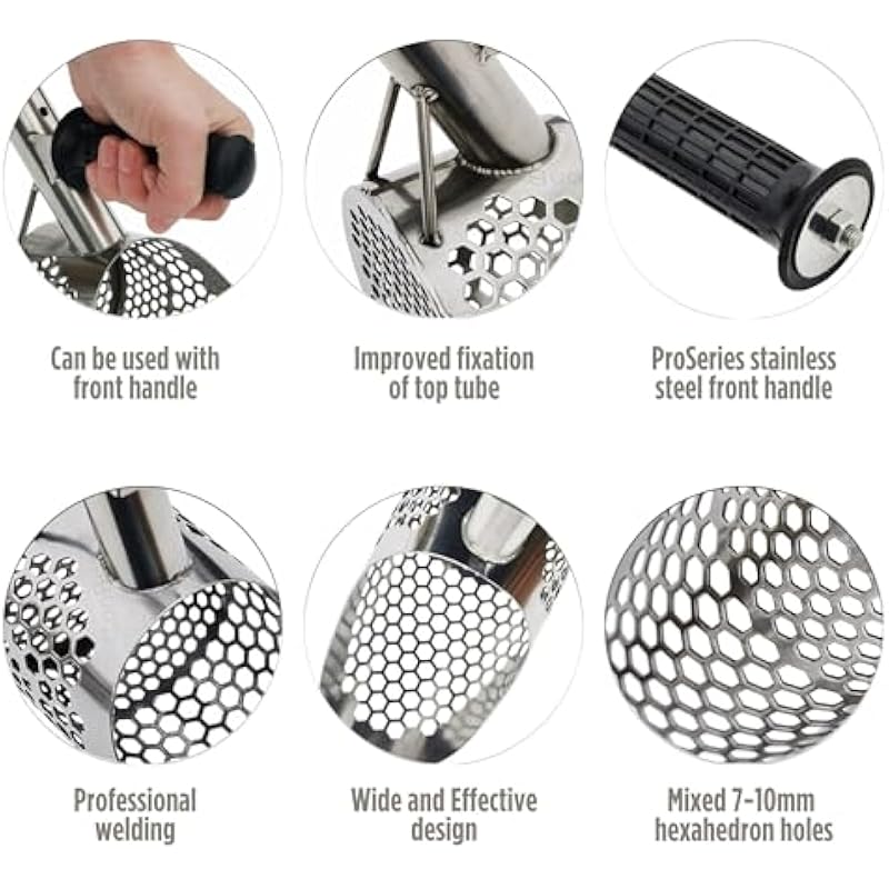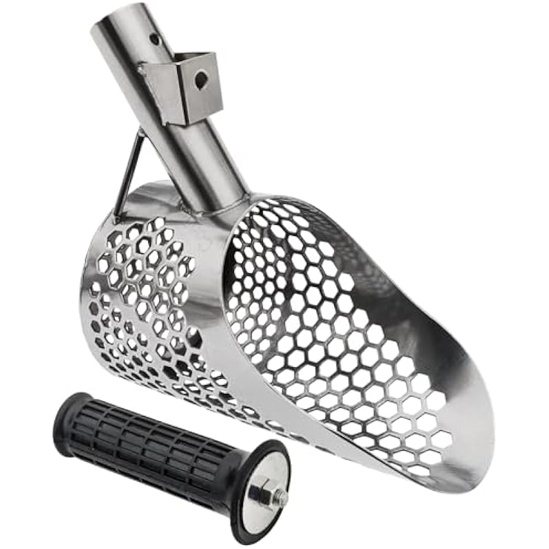 - 𝗦𝗮𝗻𝗱 𝗦𝗰𝗼𝗼𝗽 𝗗𝗲𝘁𝗲𝗰𝘁𝗼𝗿 𝗙𝗲𝗮𝘁𝘂𝗿𝗲𝘀: Made of high quality 1.5 mm stainless steel. Used mixed 7mm and 10mm holes, best for small ancient coins and finest jewelry. For production holes we used a Laser Machine cutting. Other elements of scoop, including welding, polishing – Performed at a High Level by CooB Work Team. Improved fixation of top tube.