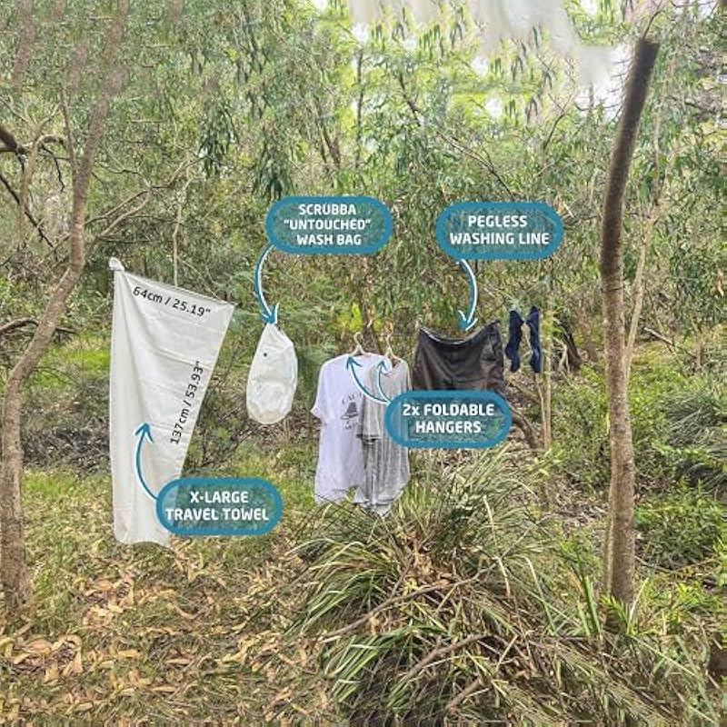 - COMPLETE SOLUTION: Includes Wash Bag, XL microfibre towel, extra-long pegless travel line, folding hangers & packing cell. Hang clothes in a tent, room or cabin – dry fast, pack tidy & stay organised.