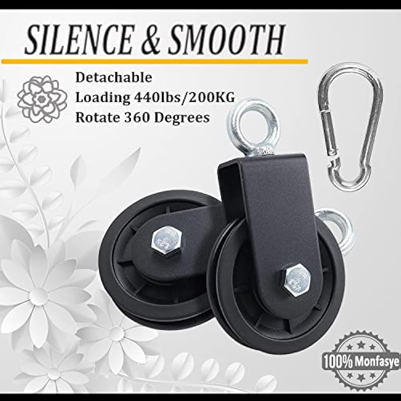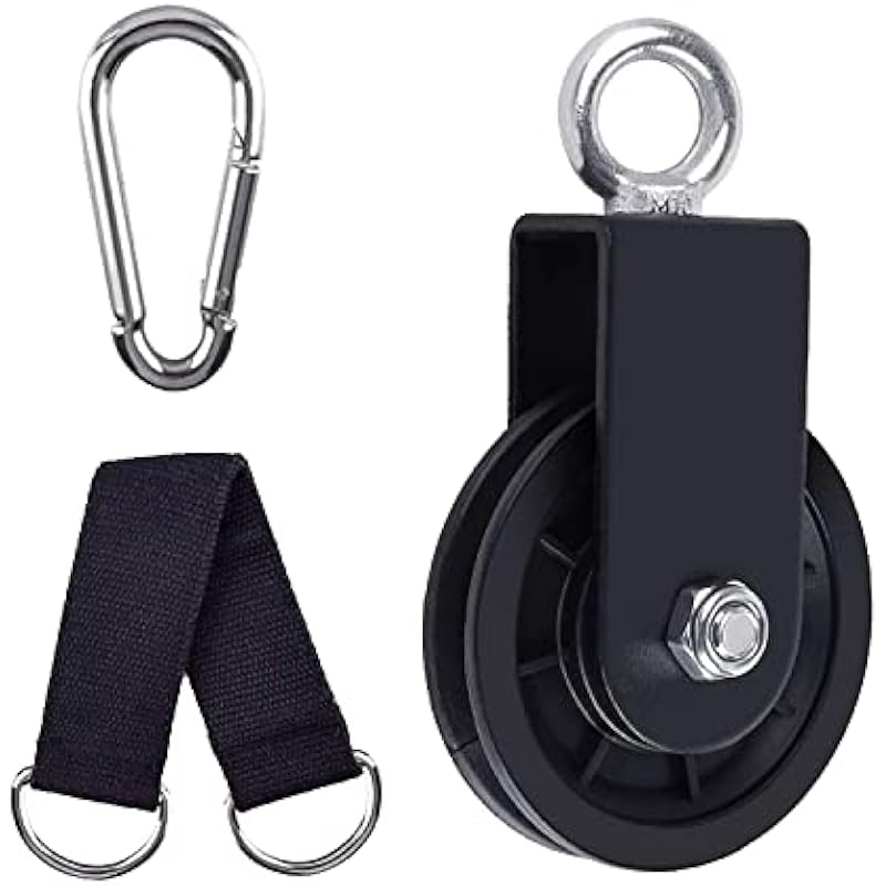 - 📤Package Includes: It comes with 1 cable pulley, 1 carabiner and 1 sling. The combination of pulley and sling avoids wear and tear of the equipment, simple and practical pulley, can be used for home fitness pulley system, DIY home projects, fitness equipment, drying racks, lift blocks, ladder lifts, store lifts, etc. Every family deserves to have, one pulley can meet the needs of customers in many ways