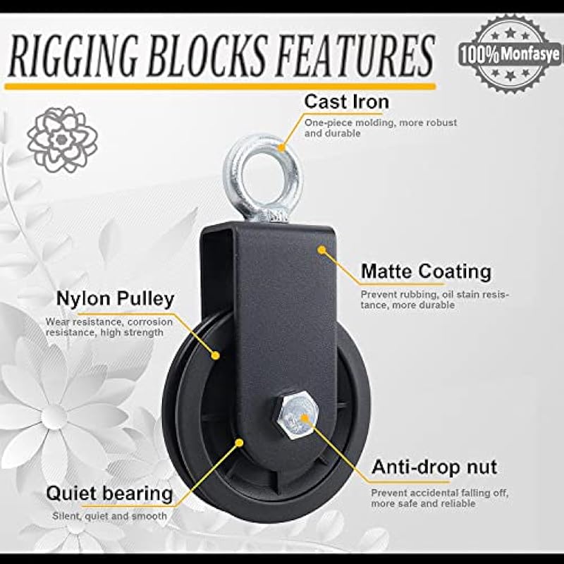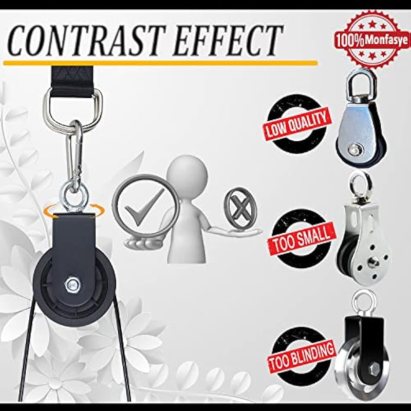 - 🎐Extra Accessories: Monfasye Pulley package is not just a super loaded rigging block, extra 25cm thickened nylon sling and 8mm carabiner, so you can get rid of the need to punch holes completely. Easy to assemble, super easy to apply, if you are more interested in disassembly, this pulley can also be disassembled and assembled by yourself with only simple tools.