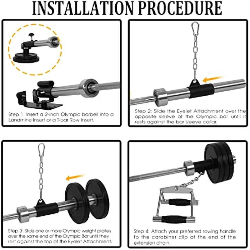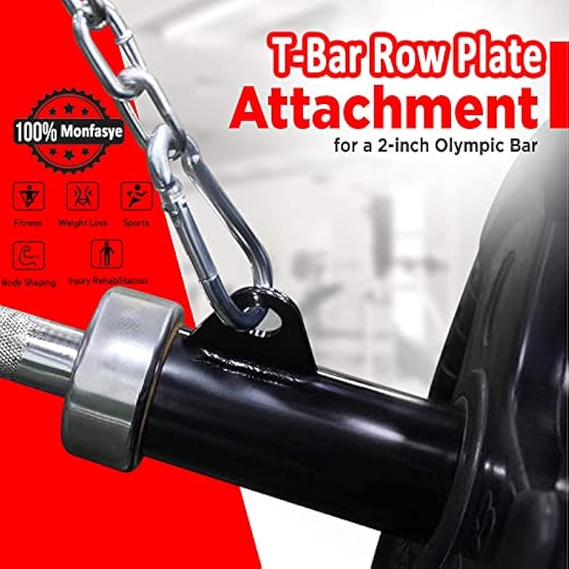 - 🔓EASY TO USE – easy to slip on the end of the Olympic bar sleeve, just slide the T-bar row attachment along the bar until it rests against the bar sleeve collar. Next add your weight plates and attach your handle to the carabiner to safely turn on your workout!