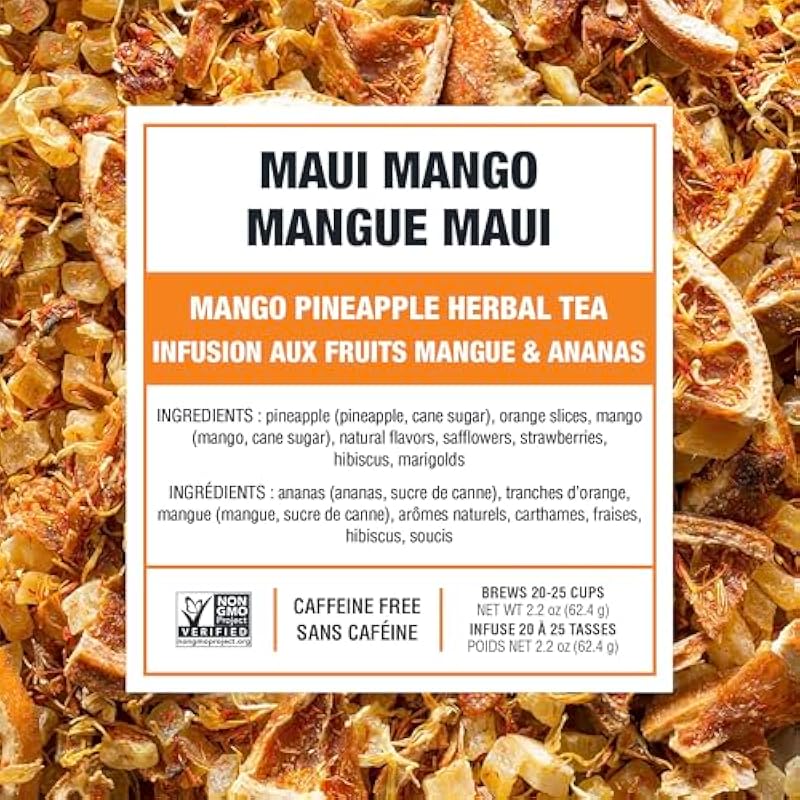 - MANGO PINEAPPLE HERBAL TEA: This exotic concoction of juicy pineapple, zesty oranges, and succulent mangoes will whisk you away to a sunny, sandy paradise with every sip.
