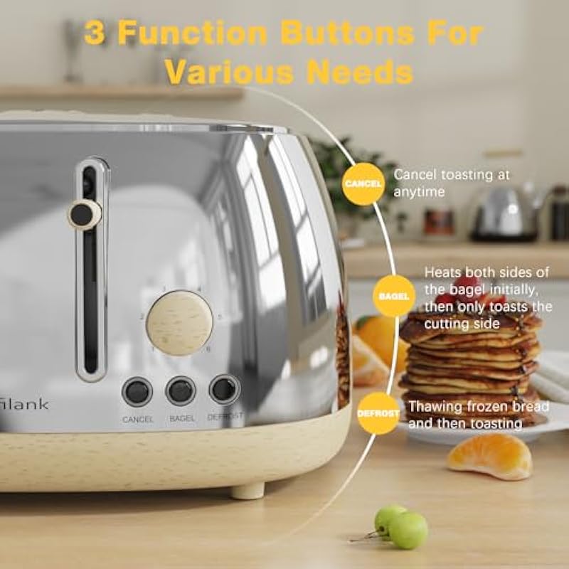 - 【EXTRA LARGE 4 SLICE CAPACITY】: With four size of 1.5 x 6 inch slots, Anfilank 4 slice retro toaster can easily handle bagels, English muffins and other thicker or smaller such as sourdough, tortillas and Texas toast. Its stainless steel design can avoid being rusted, and all stains can be easily cleaned with one wipe. Food-grade and BPA free materials could provide better safety for family members while enjoying delicious breakfast.