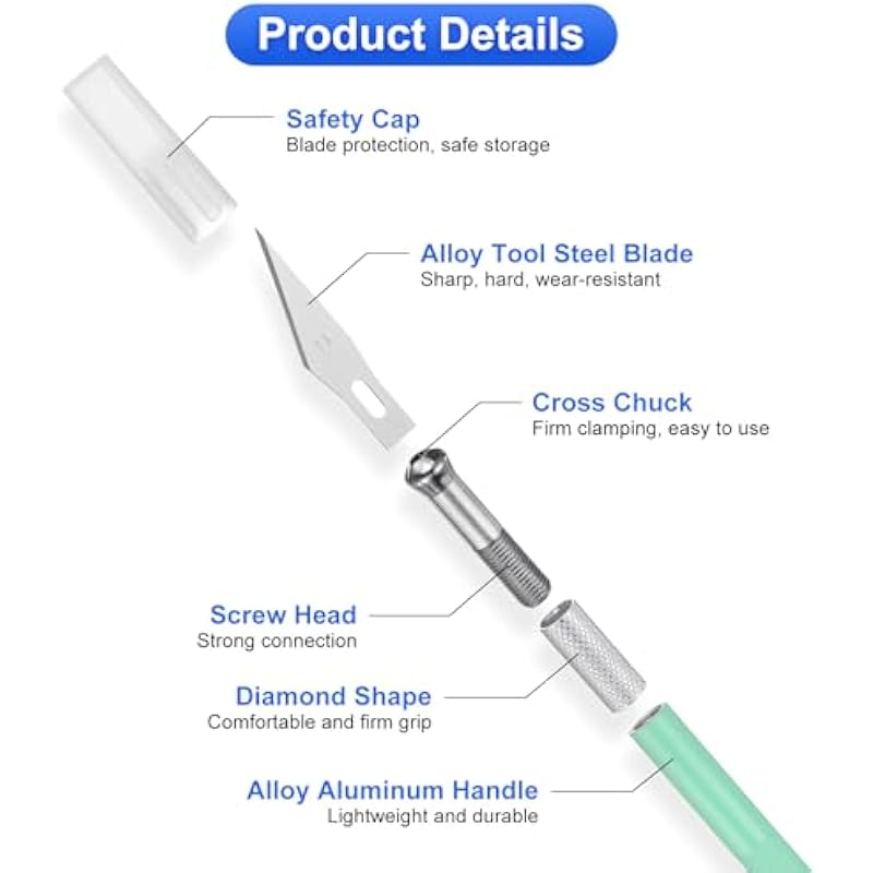 - Easy to Use: Cross chuck design, blade clamping is firm, easy to use, and craft knife blades can be easily replaced. Comes with a safety cap to protect the blade when not in use and ensure safe storage. Unique diamond-shaped ergonomic handle design provides a comfortable and firm grip during long-term use. Non-slip texture enhances stability and control.