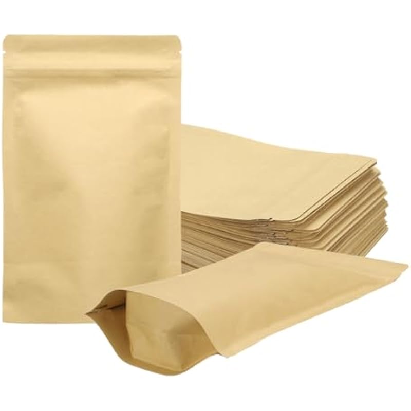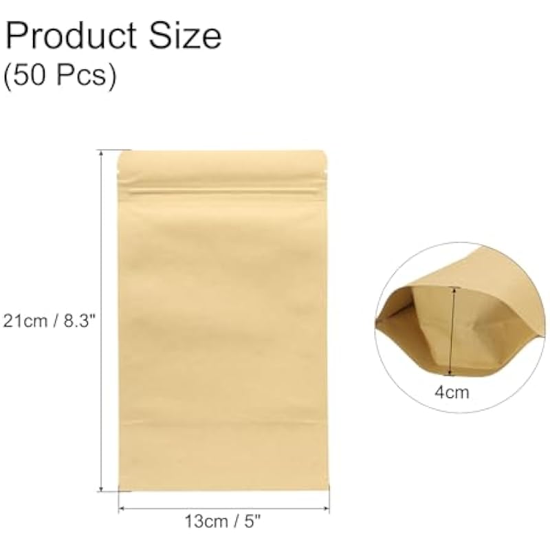 - Size and Package: This set includes 50pcs of 5×8.3 inch Kraft paper sealable bags with foil resealable seals, designed as zipper pouches for food storage or sample packaging.