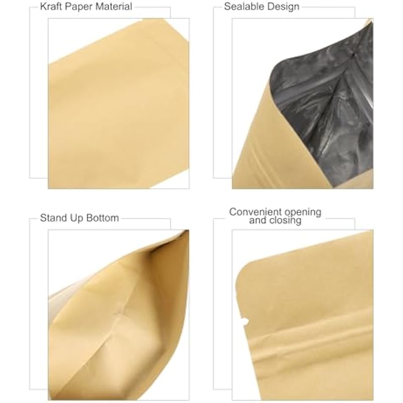- Material: The sealable bags are crafted from Kraft paper with a foil lining, these bags provide a protective barrier against moisture ensuring the freshness of stored items.