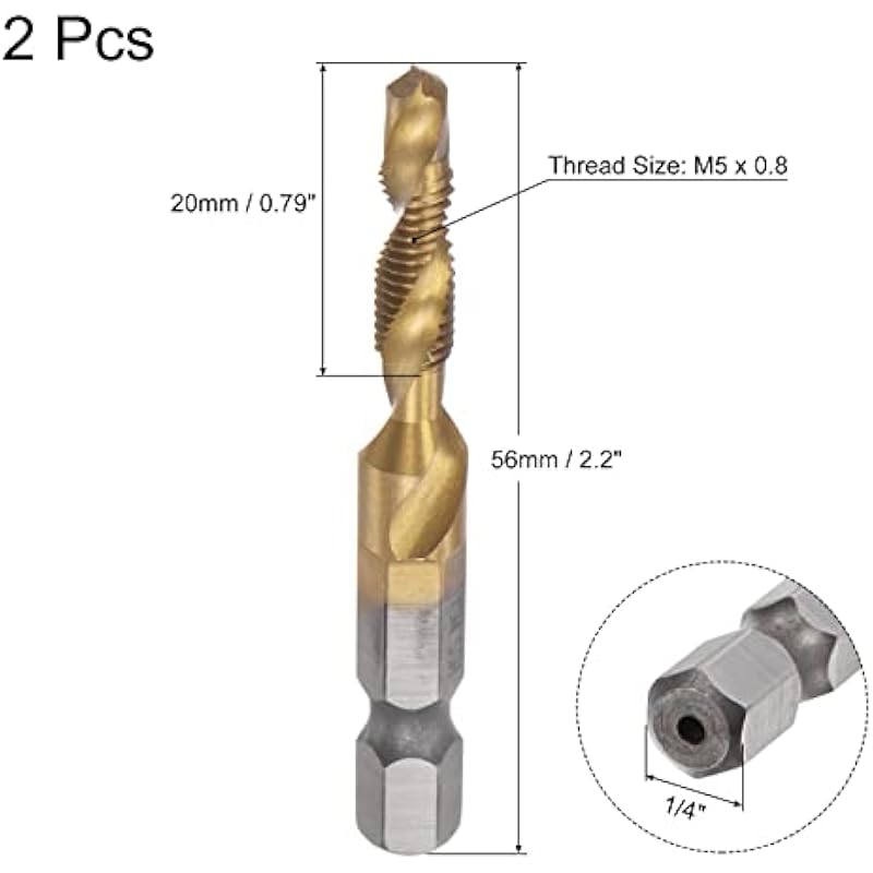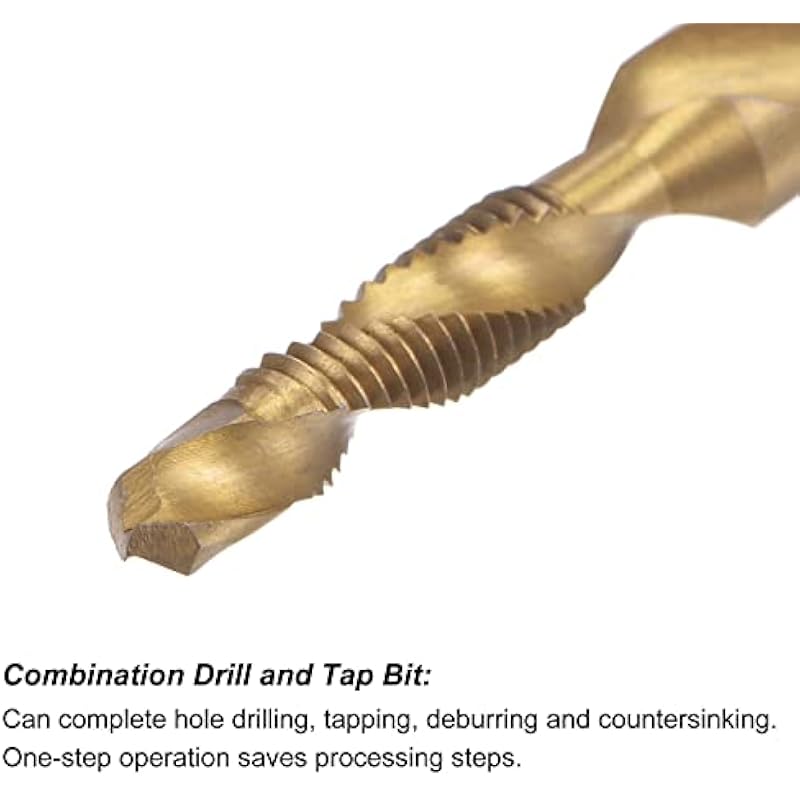 - Combination Drill and Tap Bit: Thread Size: M5 x 0.8; Hex Shank Size: 1/4″. Combination drill and tap bit set can complete hole drilling, tapping, deburring and countersinking. One-step operation greatly saves processing steps and improves working efficiency.
