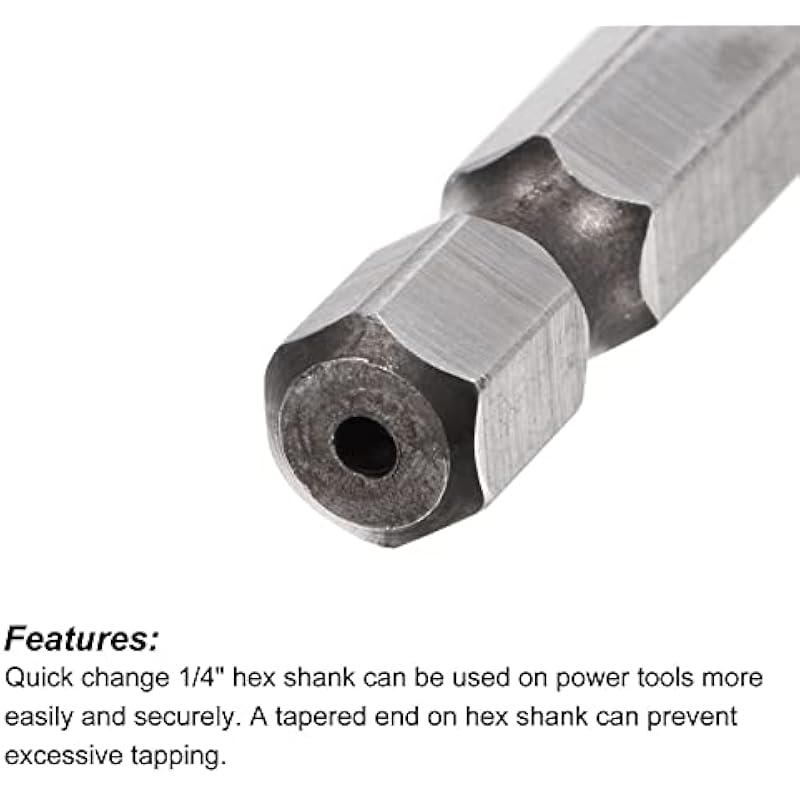 - Features: Self-centering point, do not need assistant center drilling or center punching. Quick change 1/4-inch hex shank can be used on power tools more easily and securely. A tapered end on hex shank can prevent excessive tapping.